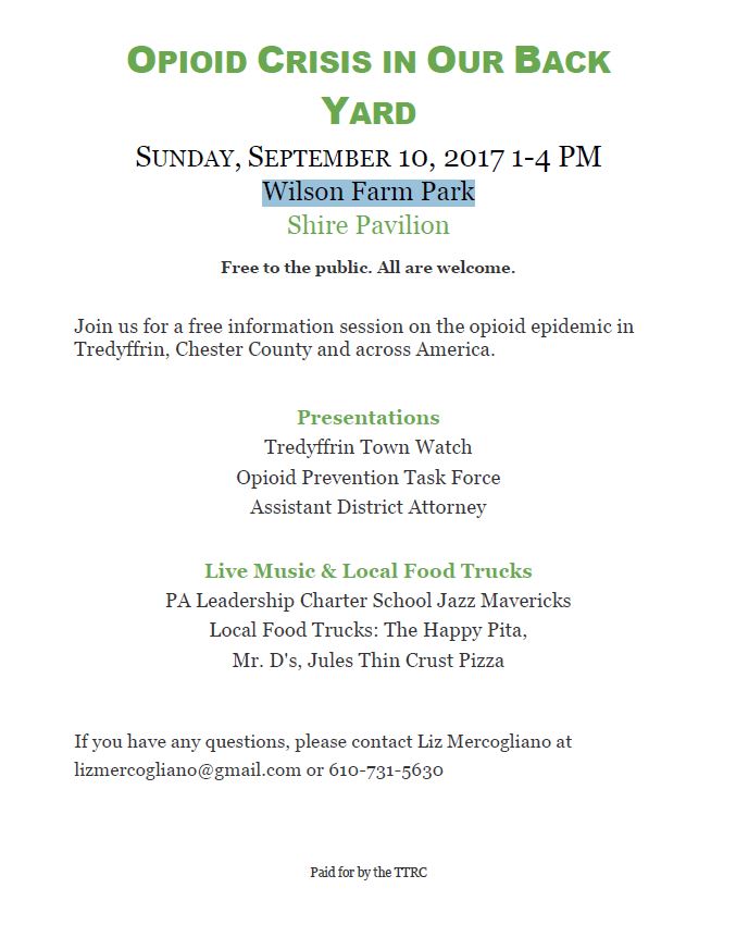 Malvern Treatment Centers staff members and community liaison Bernie Parent will attend “Opioid Crisis In Our Back Yard,” a free information session hosted by the Tredyffrin Town Watch, the Opioid Prevention Task Force and the Chester County Assistant District Attorney.
